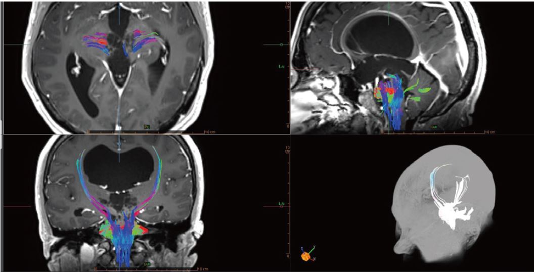 Завдяки дифузійно-тензорним картам (DTI) можна реконструювати та візуалізувати пучки нервових волокон і, таким чином, аналізувати вплив на останні інших розширень, особливо в середньому мозку (рис. 3).