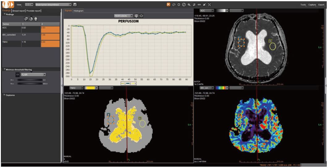Програма перегляду на робочій станції забезпечує хорошу візуалізацію та аналіз розширень простору Вірхова та Робіна з ізотропної послідовності FSE T2, отриманої в трьох площинах, а також візуалізацію гідроцефалії (рис. 2). Інструменти MPR (багатопланарна реконструкція) та MIP (проекція максимальної інтенсивності), які також доступні на робочій станції, допомагають при перегляді та аналізі зображень.