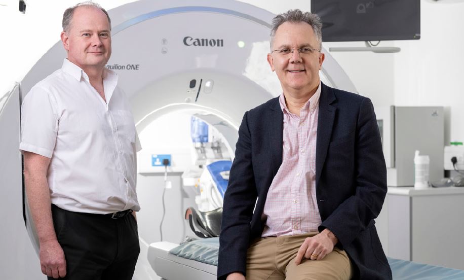 Ліворуч пан Метью Бенбоу (керівник відділень КТ та МРТ) і доктор Рассел Булл (доктор медичних наук, консультант-рентгенолог і провідний спеціаліст КТ у відділенні радіології) у Королівській лікарні Борнмута, Великобританія, з Canon Aquilion ONE / INSIGHT Edition.
