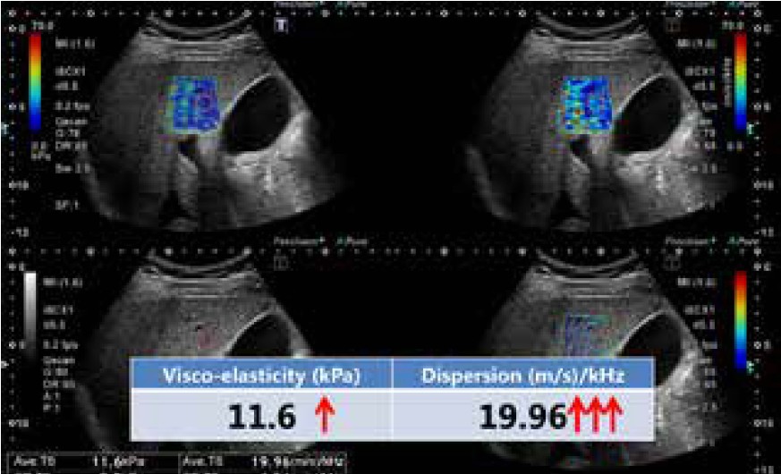 У випадку НАЖХП (випадок 4, малюнок 10) зображення в режимі B не виявило ознак жирової дистрофії печінки. Натомість НАЖХП має дещо вищу еластичність, але надзвичайно високу дисперсію. У випадку цирозу, спричиненого вірусним гепатітом С (випадок 5, малюнок 11), еластичність надзвичайно висока, але з очевидним збільшенням дисперсії.