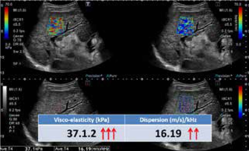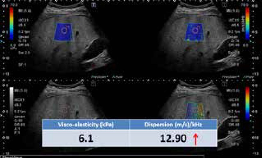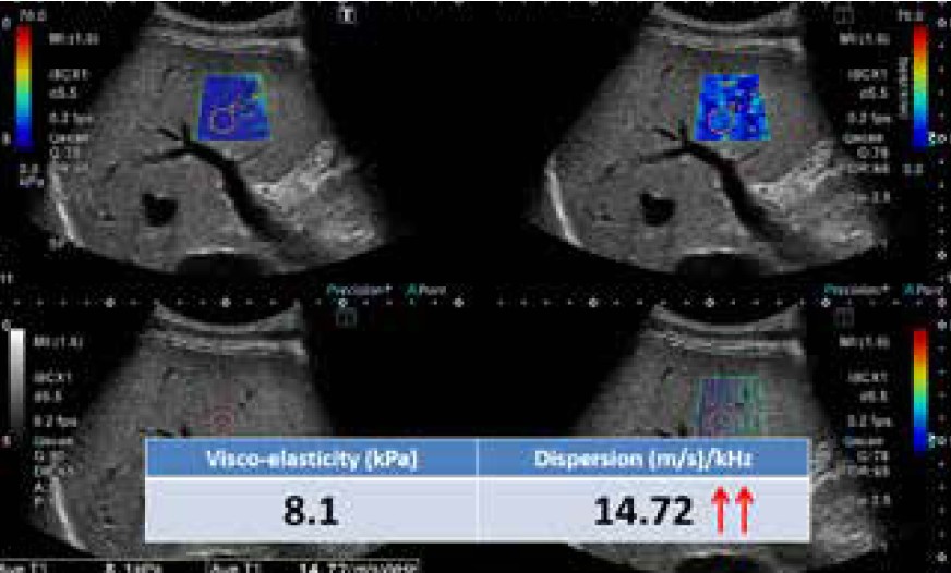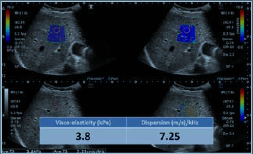 Попередній клінічний досвід дисперсійної візуалізації зсувної хвилі (SWD) показує, що еластичність є більш ефективним параметром для оцінки фіброзу печінки, тоді як в’язкість є більш ефективною для оцінки некрозапальних змін і відкладення жиру. На додаток до традиційної візуалізації в’язкопружності за допомогою зсувної хвилі, SWD є інноваційною технікою візуалізації, яка пропонує оцінку в’язкості з потенціалом для додаткової патофізіологічної інформації щодо клінічної оцінки печінки.