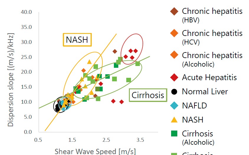 У провели велику кількість досліджень і отримали великий масив даних із використанням дисперсії зсувної хвилі Була кількісно визначена в’язкопружність за допомогою зсувної хвилі SWE та дисперсії SWD у пацієнтів із нормальною печінкою (контрольна група), неалкогольною жировою хворобою печінки (НАЖХП), неалкогольним стеатогепатитом (НАСГ), хронічним гепатитом (B, C, алкогольним), цирозом печінки (С, алкогольним) і гострим гепатитом. Наступні випадки базуються на нашому отриманому досвіді.
