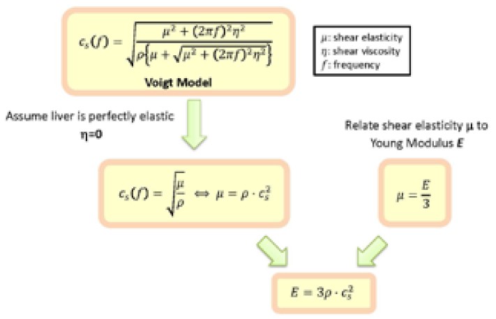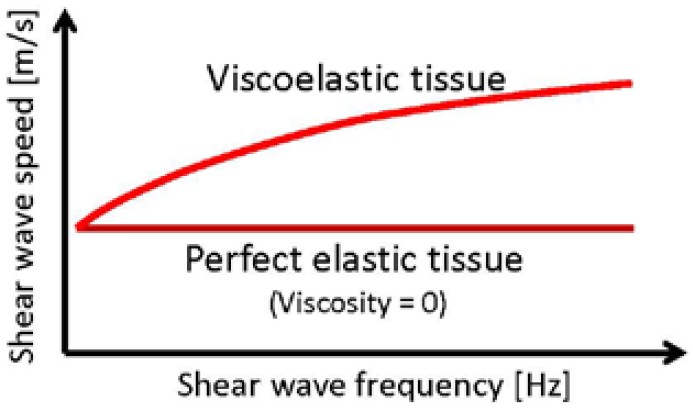 Насправді тканина печінки має в'язкопружні властивості. Вважається, що такі хронічні захворювання, як гепатит або стеатоз, підвищують в’язкість печінки. У в’язкопружній тканині швидкість зсувної хвилі зазнає частотної дисперсії, яка обумовлює зміну швидкості зсувної хвилі cs в залежності від частоти зсувної хвилі f. Взаємозв’язок між швидкістю зсувної хвилі та частотою зсувної хвилі спостерігається за допомогою моделі Фойгта, тобто швидкість зсувної хвилі буде змінюватись по різному на різних частотах з різною еластичністю та в’язкістю (Малюнок 4). В ідеально еластичній тканині швидкість зсувної хвилі не залежить від частоти зсувної хвилі.