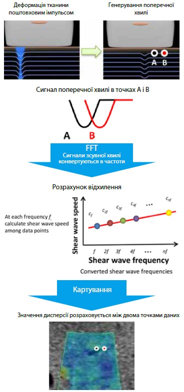 Подібно до SWE, поштовховий імпульс викликає деформацію тканини печінки, генеруючи хвилі зсуву. Обраховується зміщення в кожній точці даних (А і В на малюнку 6), отримується інформація про час і амплітуду зміщення.