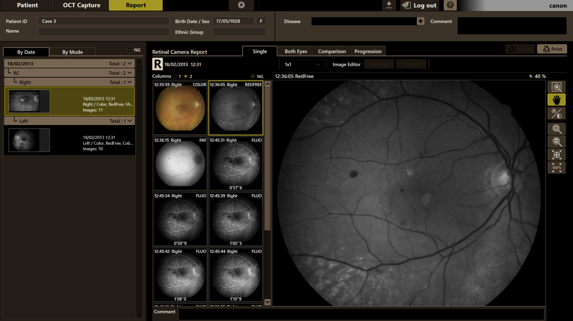 З інструментом Canon Opacity Suppression (COS) вплив від непрозорості очей буде значно знижений, оригінальна яскравість та колір сітківки будуть відновлені, кровоносні судини будуть виявлені чіткіше, тому раніше інформативно непридатні зображення зможуть забезпечити вас важливою клінічною інформацією.