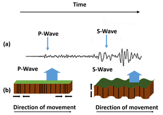 (b) Р-хвиля – це перша виявлена хвиля, за якою слідує S-хвиля, вторинна хвиля, яка коливає землю вгору та вниз