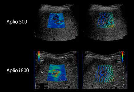 Карта поширення дозволяє спостерігати, чи плавно поширюються зсувні хвилі через тканину печінки, дозволяючи перевірити достовірність отриманих даних. За допомогою Aplio очікується, що надійні дані можна буде отримати під час одного обстеження шляхом спостереження контуру розповсюдження в часі зсувної хвилі.