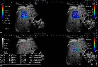 Нижче наведено випадок F1/A1 (хронічний гепатит) і випадок F4 (цироз) зі швидкістю зсувної хвилі 1,51 м/с і 3,32 м/с відповідно (рис. 10).