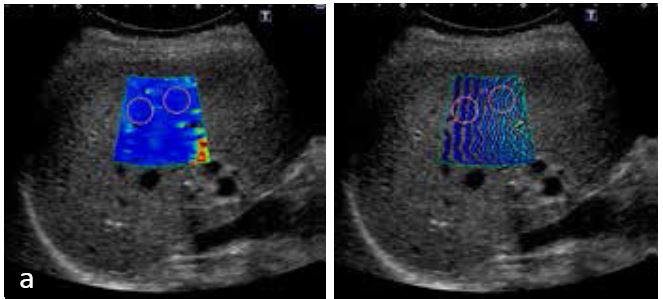 Наприклад, у пацієнта з важким ожирінням печінки та товщиною шкірної складки 3 см можна отримати дані з підтвердженою надійністю, визначивши область, в якій зсувні хвилі поширюються рівномірно, використовуючи карту поширення та вимірявши швидкість зсувних хвиль в межах області (рис. 7).