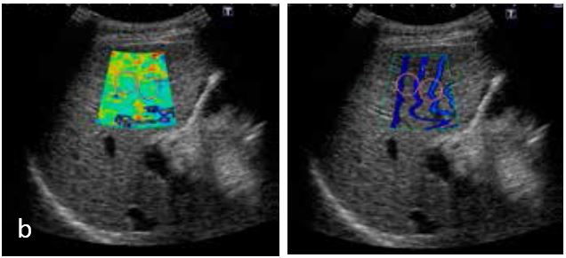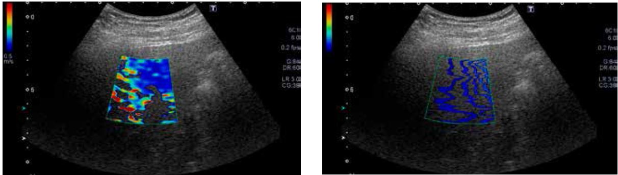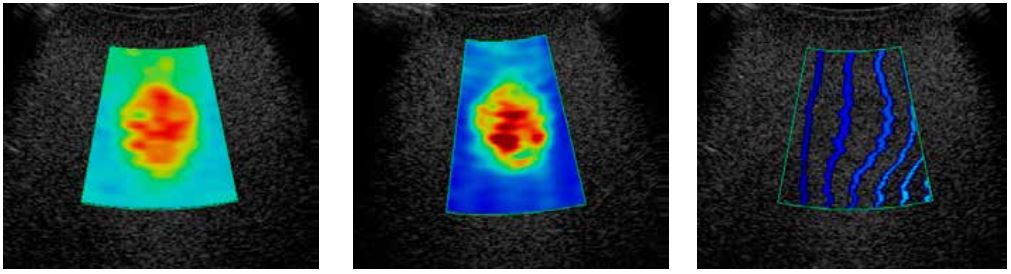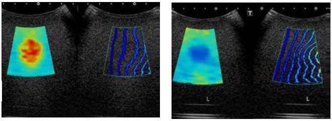 На основі кольорової карти колір змінюється з синього на жовтий/червоний, коли швидкість зсувної хвилі збільшується. Лінії на карті розповсюдження широко розділені в F4. Обидва випадки демонструють рівномірне поширення зсувних хвиль. Великі структури, такі як кровоносні судини на карту не потрапляють.