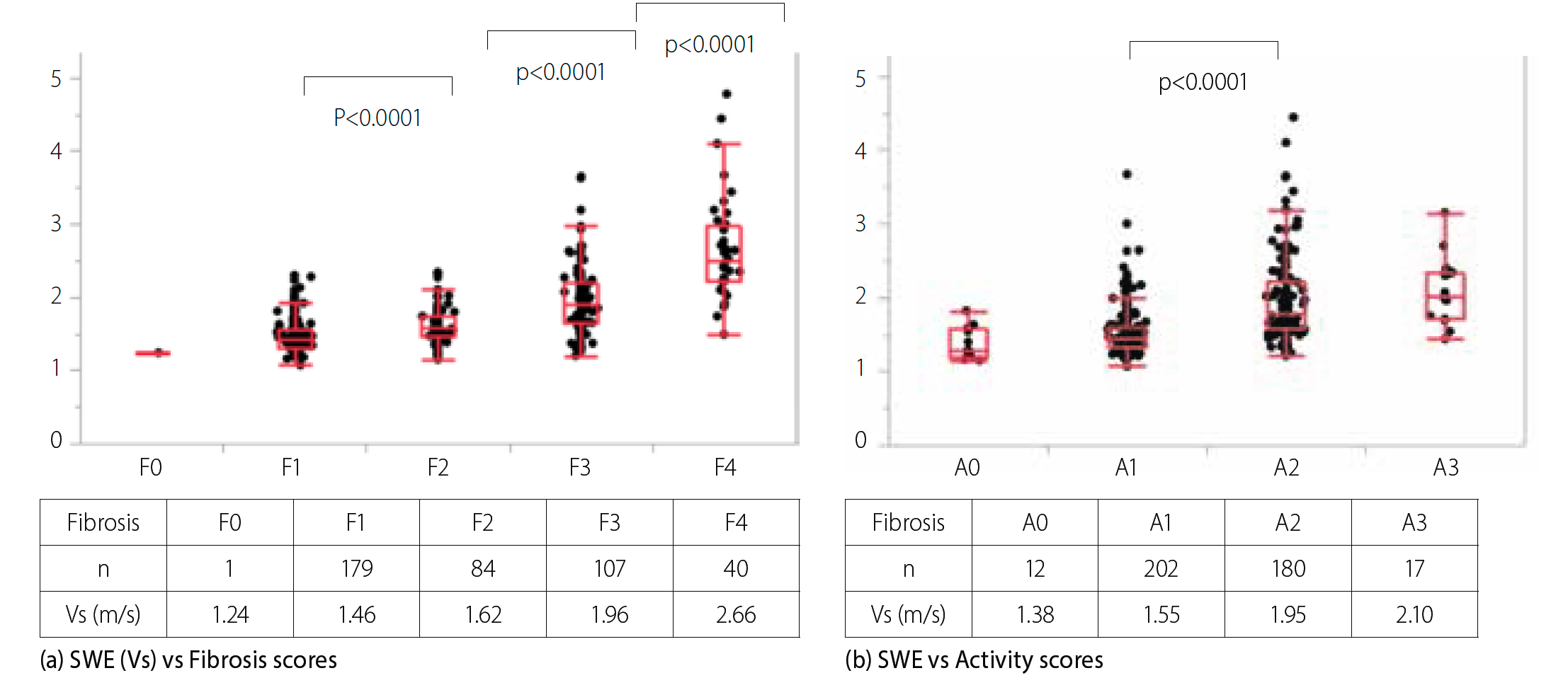 При оцінці жорсткості печінки за допомогою SWE швидкість зсувної хвилі (м/с) збільшується, коли фіброз прогресує від F0 до F4, і існує статистично значуща різниця між різними стадіями фіброзу. В останні роки спостерігається тенденція до зростання пацієнтів із запаленням печінки, таким як NASH і гепатит. Прогресування фіброзу при хронічному гепатиті зазвичай супроводжується запаленням. Однак існує лише статистично значуща різниця між A1 і A2.