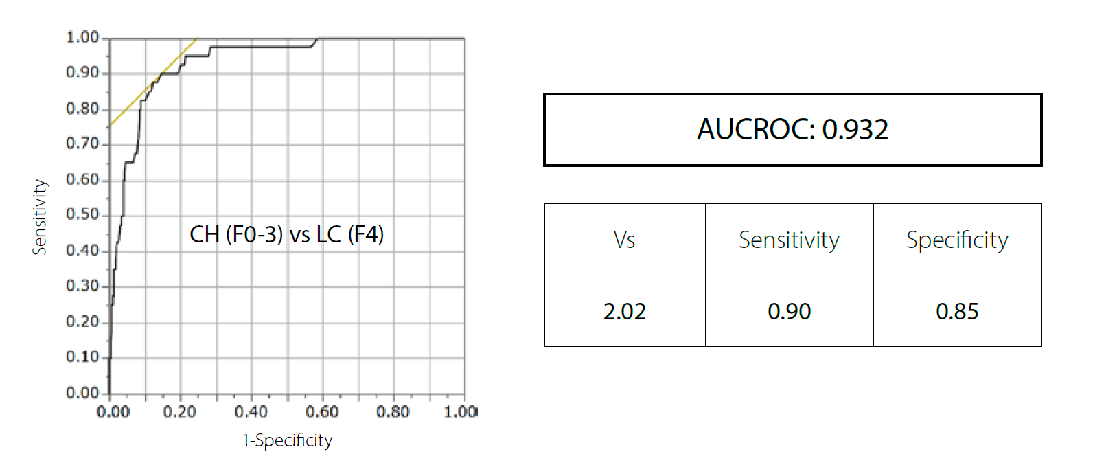 Згідно з результатами, отриманими в нашому закладі, порогове значення для цирозу печінки при SWE становить 2,02 м/с. Пацієнти, у яких швидкість зсуву хвилі дорівнює або перевищує 2,02 м/с, свідчить про діагноз цирозу печінки. Площа під кривою ROC становила 0,932, що демонструє чудову діагностичну точність SWE при обстеженні цирозу.