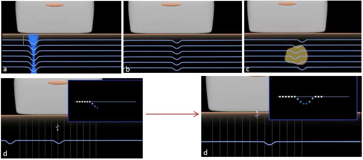 Концепцію SWE можна пояснити на прикладі землетрусу. Під час землетрусу енергія, що вивільняється від руху розлому, породжує сейсмічні хвилі. Генерується первинна хвиля (P-хвиля), а потім вторинна сейсмічна хвиля (S-хвиля), яка поширюється набагато повільніше, ніж P-хвиля. S-хвиля (хвиля зсуву) коливає землю перпендикулярно до напрямку руху. S-хвилі поширюються швидше в твердій речовині, ніж у м’якій, оскільки їх частинки більш конденсовані. У випадку SWE імпульс поштовху, що випромінюється від датчика, подібний до руху несправності, генеруючи ультразвукову хвилю, яка деформує тканину печінки (Рис. 2a). Хвиля зсуву створюється під час деформації тканини.