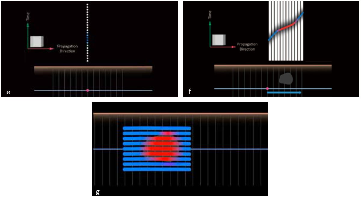 Подібно до S-хвилі землетрусу, хвилі зсуву передаються перпендикулярно до ультразвукової хвилі (рис. 2b). У людському тілі зсувні хвилі передаються повільно зі швидкістю приблизно від 1 м/с до 10 м/с, завдяки чому їх можна виявити за допомогою діагностичної ультразвукової системи. Крім того, швидкість поширення істотно відрізняється в залежності від жорсткості тканини. Якщо в тканині є таке ураження, як пухлина, швидкість зсуву хвилі в цій області відрізняється від швидкості в навколишніх тканинах. Якщо ураження більш жорстке, зсувні хвилі поширюються швидше (рис. 2c), і навпаки. Зсувні хвилі, що поширюються, виявляються за допомогою імпульсів відстеження (рис. 2d).
