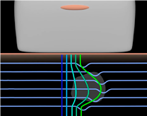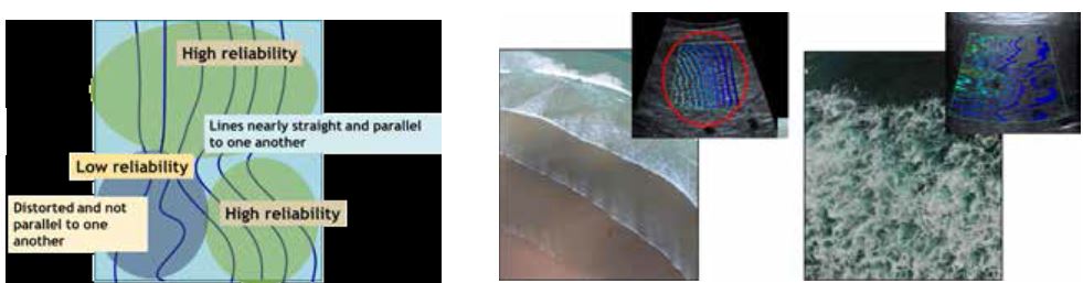 Карта поширення (контур розповсюдження в часі) служить індикатором надійності для збору даних SWE, щоб підвищити точність діагностики та надійність між операторами. Карта поширення відображає хвильові фронти зсувної хвилі через фіксований інтервал часу, показуючи, чи плавно поширюються зсувні хвилі (рис. 4). Відстань між контурними лініями ширша в більш жорстких тканинах через довший часовий інтервал (рис. 5). У областях з паралельними контурними лініями зсувні хвилі поширюються плавно, а надійність збору даних висока. У областях, де контурні лінії спотворені або не паралельні, надійність збору даних є низькою. Іншими словами, надійність збору даних можна просто перевірити, спостерігаючи за контурними лініями (рис. 6).