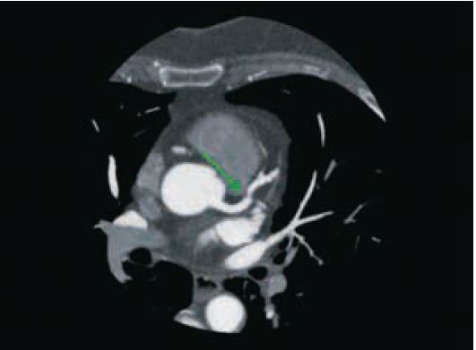 Рис. 8 КТ-ангіографія коронарних судин. ІМТ 26. Критичний стеноз LAD (стрілка). Доза 0,8 мЗв