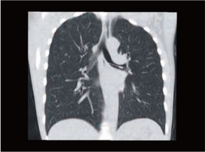 Рис. 11 КТ грудної клітки з ультранизькою дозою. 0,1 мЗв - 35- річна жінка. Голка у лівому головному бронху. DLP 6