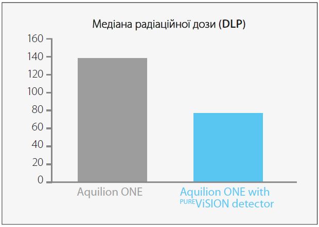 Медіана DLP на Aquilion ONE із PUREViSION становила 77,5 мГр·см (1,08 мЗв) у порівнянні з середнім значенням DLP 139 мГр·см (1,9 мЗв) на нашому попередньому Aquilion ONE (мал. 2). Це являє собою вражаюче зниження дози випромінювання на 44%, яке можна пояснити лише покращеною ефективністю детектора PUREViSION.