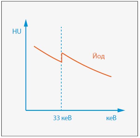 Малюнок 3 на цьому графіку показано раптове збільшення щільності HU йоду при (і вище) 33 кеВ через ефект К-edge.