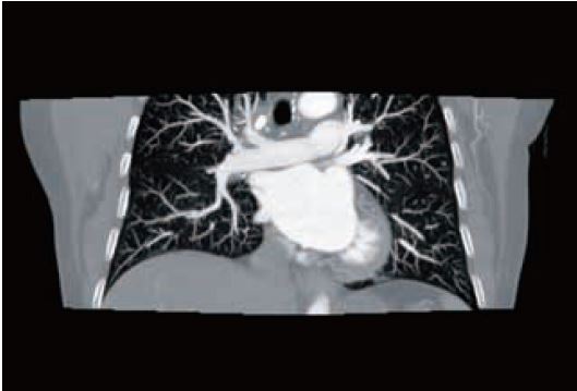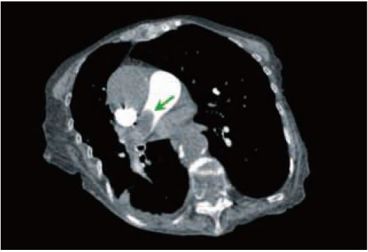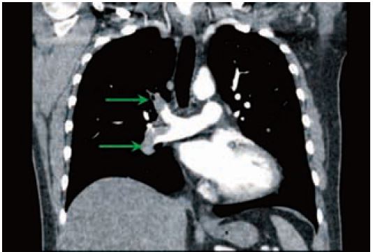 Рис. 5 КТ-ангіографія з вільним диханням та одним обертом – 80 кВ. 30 мл ніопаму 370 при 3 мл/с. Доза 0,5 мЗв. Велика емболія легеневої артерії закупорює праву легеневу артерію (стрілка).