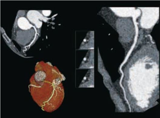 Наші типові пацієнти для обстеження КТА коронарних судин тепер отримують субмілізівертні дози опромінення з відмінною якістю зображення (рис. 8, 9). У молодих радіочутливих пацієнтів тепер ми можемо виконувати сканування значно нижче 0,5 мЗв, щоб відповісти на клінічне запитання (рис. 10). Таким прикладом є дослідження аномальних коронарних артерій, де справді все, що потрібно, — анатомічний огляд.
