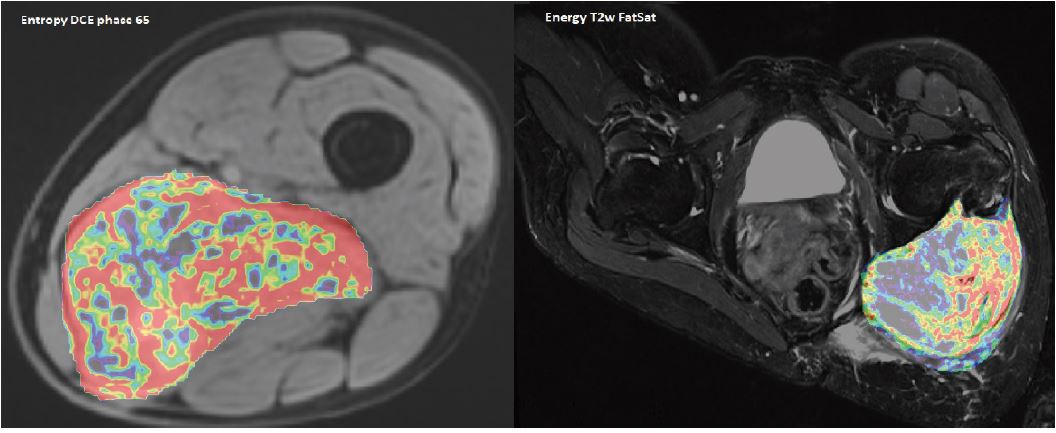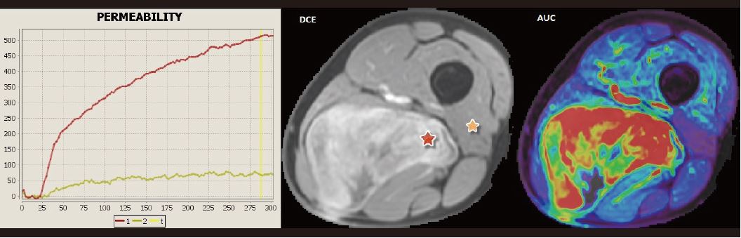 Багатопараметричний аналіз надає додаткову інформацію про структуру, васкуляризацію та їх зміни під час лікування. У цьому випадку міксоїдної ліпосаркоми (рідкісна пухлина м’яких тканин з оманливим доброякісним виглядом) (рис. 3) порівняння між пухлиною та здоровим м’язом можна здійснити на основі поглинання контрастної речовини та аналізу кінетики. Тут відзначається швидке посилення контрасту з наступним безперервним посиленням без вимивання, що добре відомо для пухлин із великим діапазоном інтерстиціальної тканини. Ці знахідки характерні для таких пухлин.