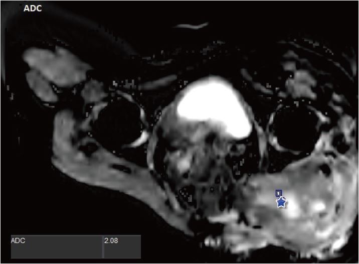 Розрахунок дифузії та ADC (рис. 4) також є придатними інструментами для диференціації міксоїдних пухлин від іншого типу саркоми з досить високими значеннями (2,08 +/- 0,51,10-3 мм2/с) відносно високої частки муцину та низький вміст колагену.