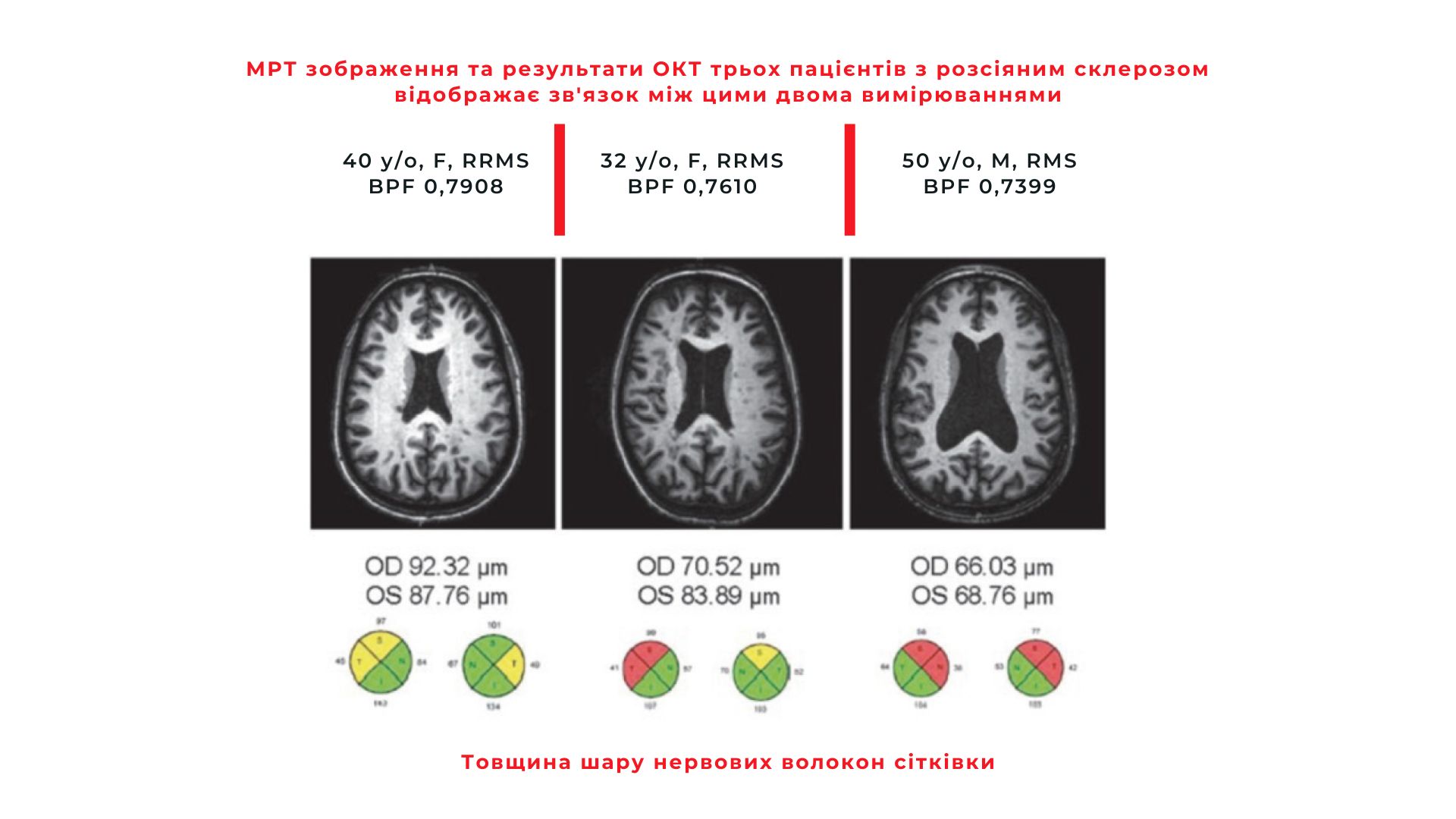 «Те, що відбувається на сітківці, відображає те, що відбувається всередині мозку при розсіяному склерозі» – продовжив він. «Дослідження показали, що атрофія у головному мозку через розсіяний склероз з плином часу дуже сильно корелює з втратою товщини шару нервових волокон сітківки з часом. Отже, чим менший шар нервових волокон сітківки тобто тим більше атрофії».