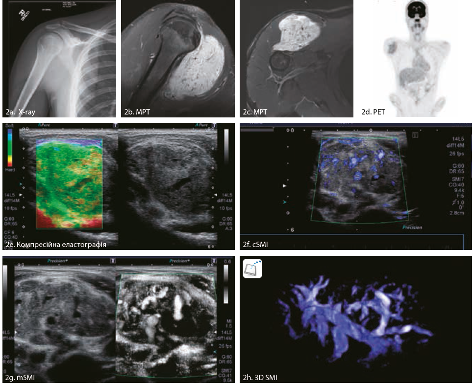 Рентгенографія (Малюнок 2а) виявила потовщення м’яких тканин, але без ураження кісток або кальцифікацій. МРТ (рис. 2b-2c) показало велику масу м'яких тканин, що збільшується, примикає до плечового суглоба і розширює сусідні м'язові пучки. Маса викликала підозру на саркому. ПЕТ-візуалізація (рис. 2d) передбачуваного злоякісного новоутворення показала помірне поглинання F18-FDG масою, але поглинання менше, ніж можна було б очікувати для агресивної пухлини.