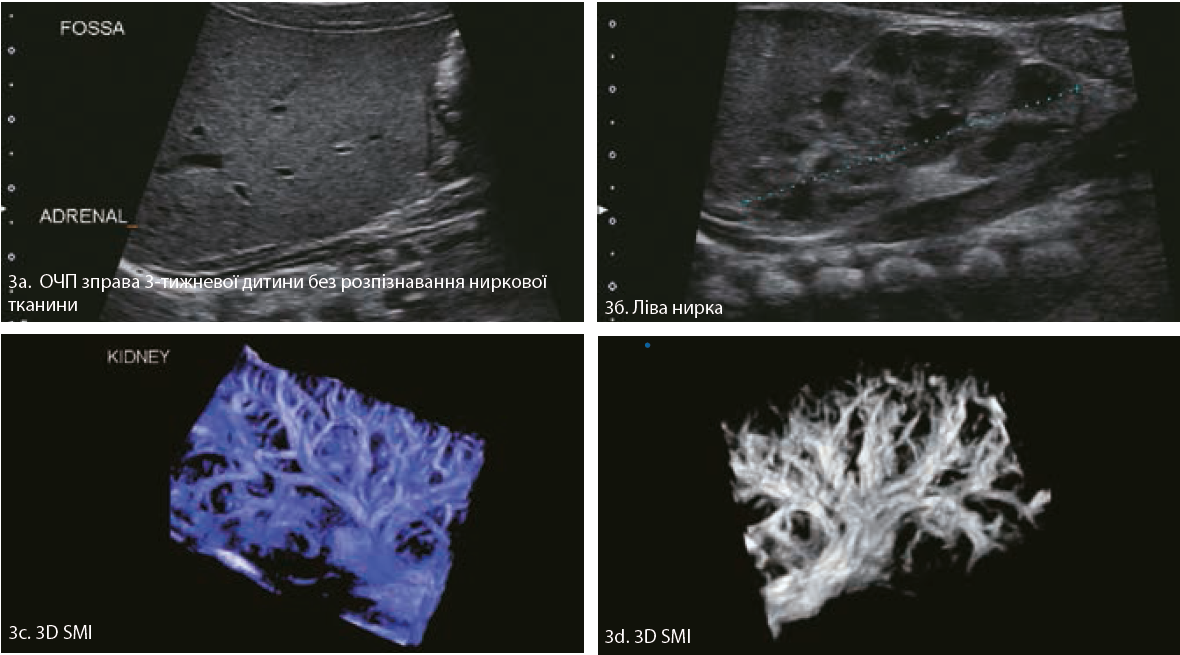 У новонародженої дитини на ранніх термінах вагітності діагностовано кістозну нирку. Контрольне УЗД проводили у віці 3 тижнів для визначення стану нирок. На правому боці немовляти ультразвукове дослідження (Малюнок 3а) показало відсутність розпізнаваної ниркової тканини та нормальний вигляд надниркової залози. На лівому боці немовляти ультразвукове дослідження (Малюнок 3b) показало нормальну нирку, яка була у верхньому діапазоні нормальної довжини. Імовірно, під час вагітності була інволюція правої нирки через обструкцію високого ступеня або мультикістозну дисплазію.