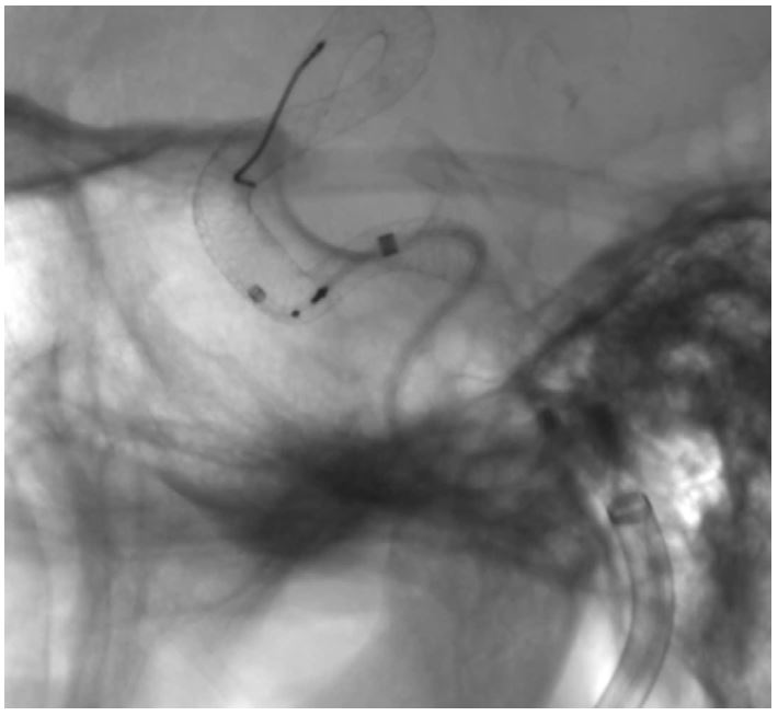 Малюнок 2: Демонструється отримання рентгеноскопічного зображення PED, на FOV 8x8 см у HD режимі, PED використовується для лікування лівої кавернозної аневризми ВСА. Розташування PED на стінці судини можна точно оцінити за допомогою введеного контрасту на останньому зображенні.