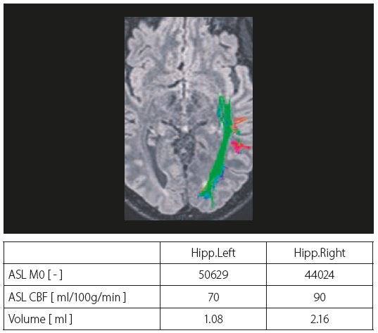 Зображення FLAIR показують гіперінтенсивний сигнал у лівому гіпокампі, а MPRAGE використовується для класифікації склерозу. ROI встановлюються як на нормальній зоні, так і на склерозі карт ADC і церебрального кровотоку. ASL показує ліву скроневу гіпоперфузію.