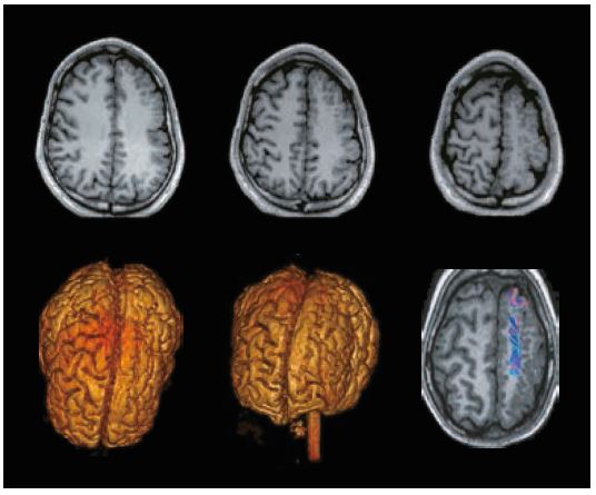 Рис. 4. Показані невеликі складки на аксіальних зображеннях MPRAGE (угорі), зниклі звивини під час рендерингу об’єму (внизу ліворуч і посередині) та аномальні ділянки волокон білої речовини на DTI (унизу праворуч).