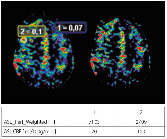 ПЕТ-КТ – це одне з обстежень, яке можна виконати для виявлення аномалій перфузії, які можуть свідчити про метаболічні та функціональні аномалії. У цих випадках перфузія ASL є хорошою альтернативою, яка є неінвазивною, не вимагає опромінення та її легко запланувати за стандартним протоколом. На рисунку 4 показано на картах церебрального кровотоку дефекти перфузії на лівій лобовій стороні, які можна співвіднести з аномальними складками в цій області.