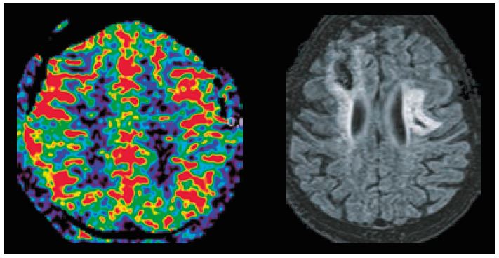 Рис. 7. Після операції ASL-послідовність показує нормальну перфузію мозку. Осьовий MPR Flair показує деякі інсультні порожнини з гліозом.