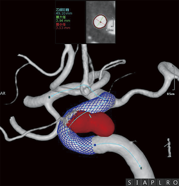 Пацієнт надійшов із нерозірваною аневризмою правої внутрішньої сонної артерії (максимальний діаметр 11,6 мм) і отримав лікування ФД. Зображення 3D-DSA використовувалося для визначення WA (робочого кута), а інструмент підтримки CAA (cerebral aneurysm analysis) використовувався для вимірювання діаметра материнської судини (4,26 мм × 4,02 мм на проксимальному кінці, 5,34 мм × 5,0 мм у середній точці та 3,71 мм × 3,57 мм на дистальному кінці, із зоною посадки 21 мм) (мал. 4).
