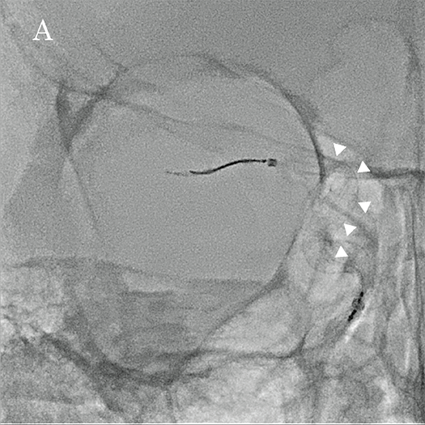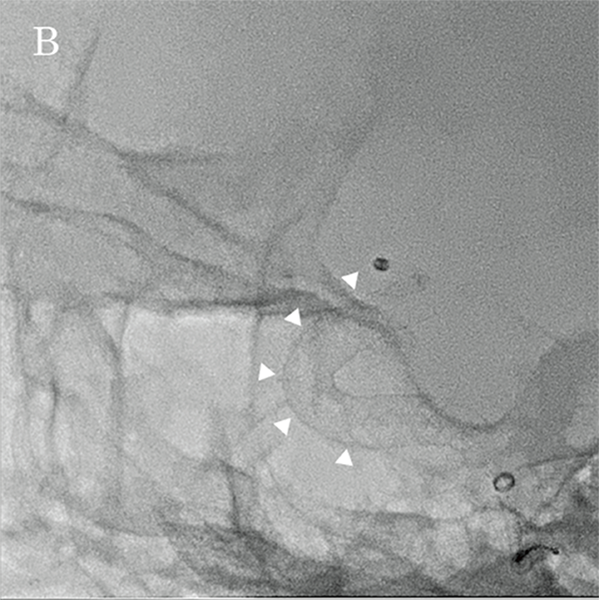 Погане розгортання спостерігалося на проксимальному кінці FD (мал. 7A та 7B), тому було виконано PTA (транслюмінальну ангіопластику). DSA показала ознаки легкого затемнення. Катетер видаляли після підтвердження наявності або відсутності внутрішньочерепного крововиливу за допомогою Alpha CT.