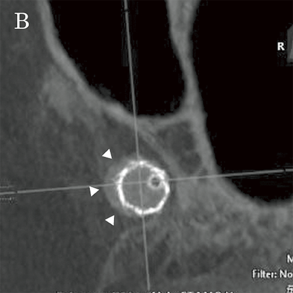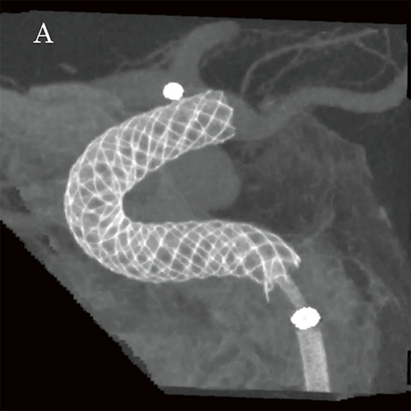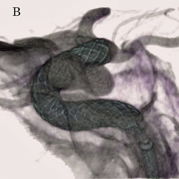 На основі цих вимірювань було обрано пристрій для емболізації Pipeline™ (PED) (4,75 мм × 16 мм; Medtronic, Японія), аневризму лікували, спостерігаючи за флюорографічними зображеннями детектора високої чіткості (мал. 5A та 5B). Пристрій було розгорнуто від C2 (біфуркація задньої сполучної артерії) до C4, а розгортання FD і стан кримпування материнської судини підтверджено Alpha CT (мал. 6A і 6B).
