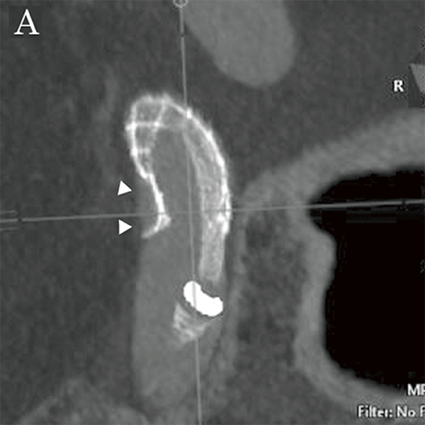 Малюнок 7B: Мультипланарна реконструкція Alpha CT після розміщення FD. Стрілками показано ознаки поганого розгортання (коротка вісь на проксимальному кінці).