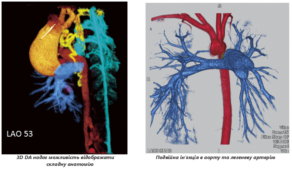 С-дуга обертається навколо пацієнта двічі для протоколів отримання 3D DSA. Перший спін набувається без контрасту, а другий – з введенням контрасту. Дані, отримані під час двох обертань, автоматично віднімаються, видаляючи кістки протягом усього обертання. В результаті реконструйовані об’єми 3D DSA відображають лише контрастну анатомію судин.