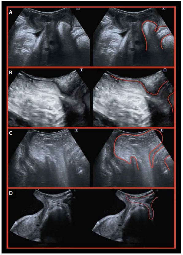 Малюнок 8. Ультразвукова диференціальна діагностика заднього відділу: ректоцеле (A), ректоентероцеле (B), ентероцеле (C), ректальна інвагінація (D).