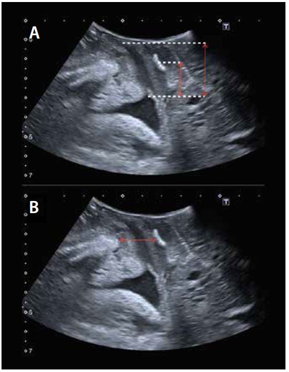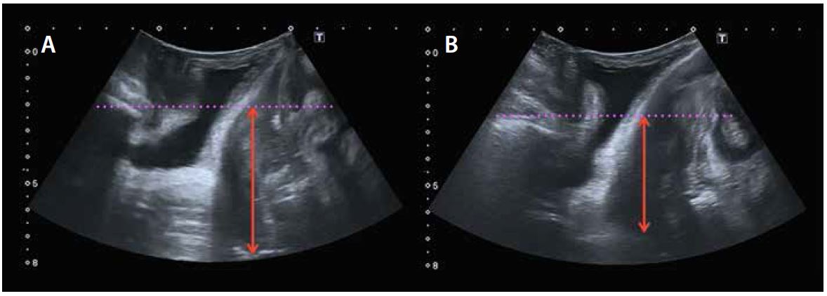 Малюнок 7. Діагностика опущення матки з різницею між положенням спокою (A) і положенням Вальсальви (B), відстань між лобком і матковим дном > 15 мм.