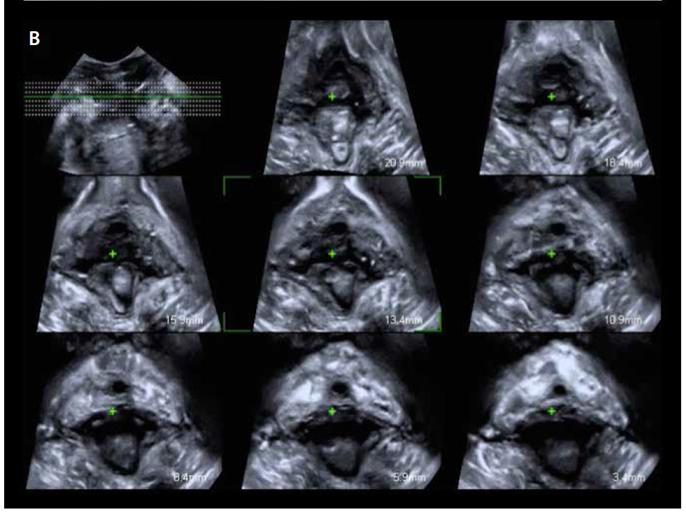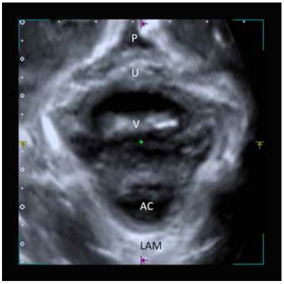 Аксіальне дослідження LAM зосереджено на площині мінімальних розмірів діафрагми, обмеженої області в його передній частині та каудальною частиною лобкового симфізу, а в його задній частині — аноректальним кутом, акцентованим центральною частиною LAM (мал. 3A). Тривимірне ультразвукове дослідження тазового дна дозволяє візуалізувати аксіальну площину, дозволяючи оцінити LAM та урогенітальний гіатус (мал. 3B).