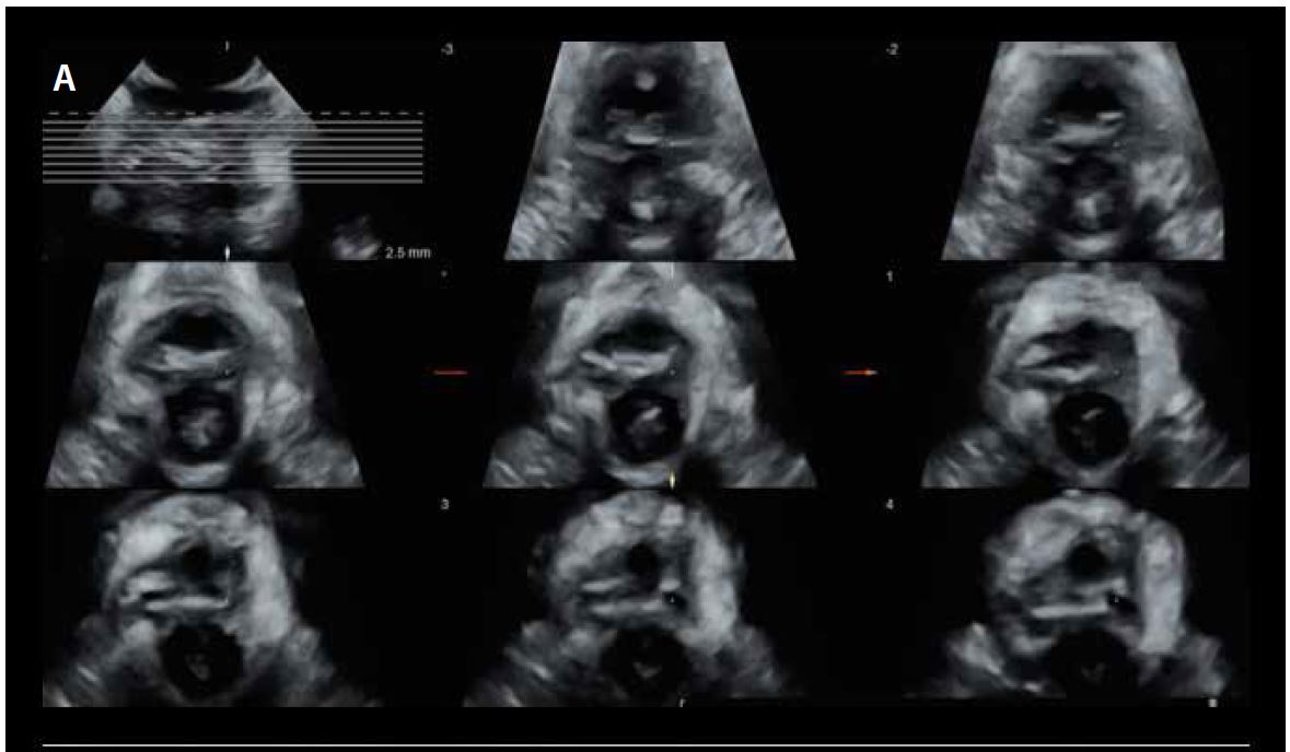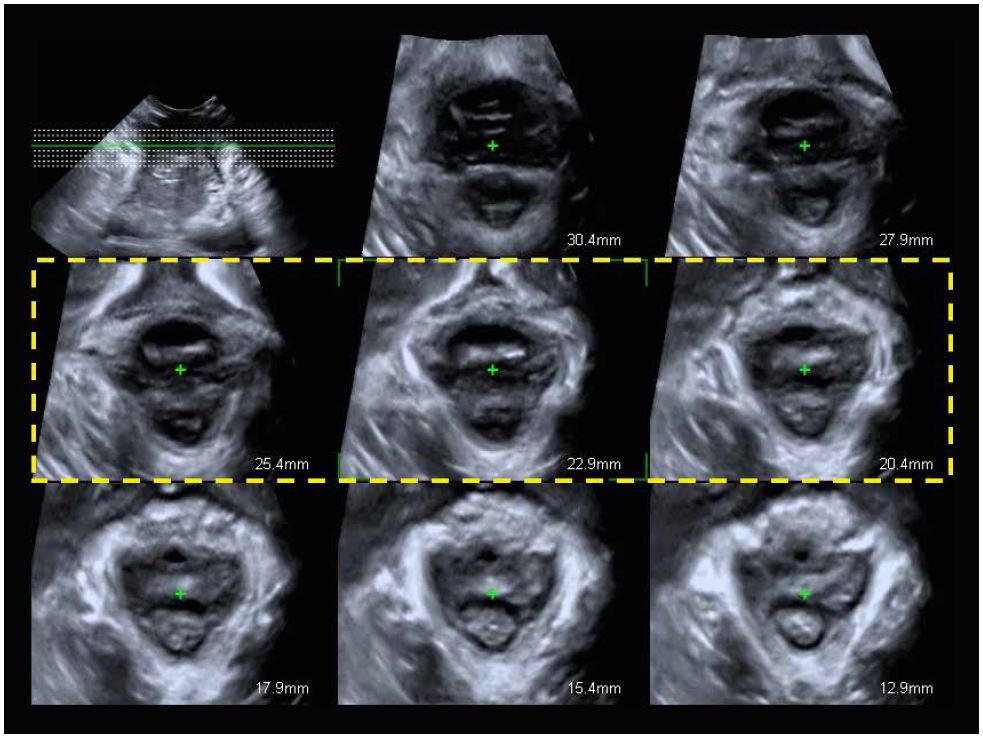 Мультиплощинна реконструкція з площини мінімальних гіатальних розмірів (мал. 10) є стандартизованим і еталонним способом оцінки авульсії LAM. Осьові площини отримують з інтервалом 2,5 мм (5 мм каудально і 12,5 мм краніально), оцінюючи загалом 8 площин (мал. 11). Точне розташування 8 площин встановлюється по трьох центральних площинах (жовта пунктирна лінія на мал. 11):