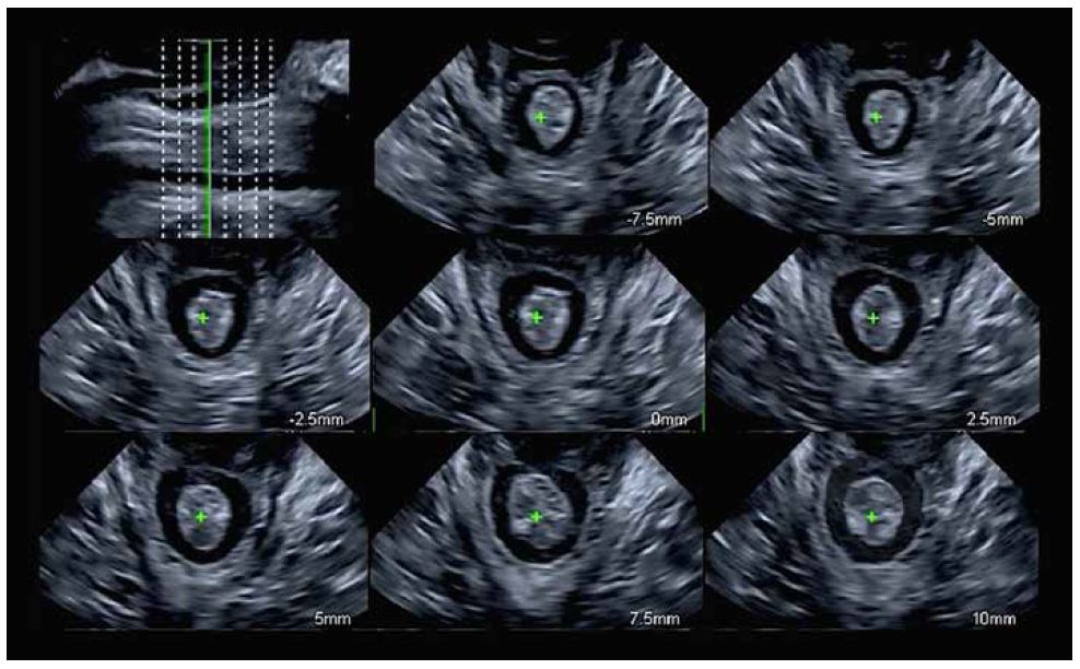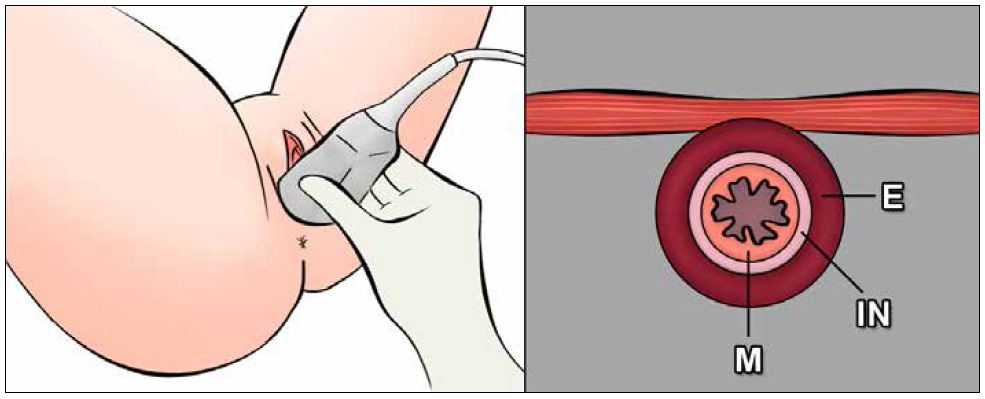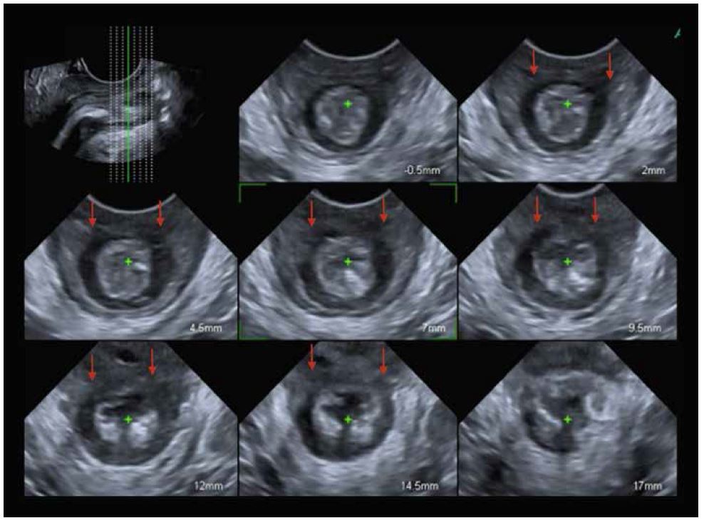 Для оцінки анального сфінктера датчик слід розташувати поперечно над промежиною, нахиливши зонд до анального отвору (мал. 13). Бажано фіксувати об’єм під час скорочення, щоб краще розрізняти тканини. Мультипланарна оцінка дозволяє проаналізувати весь анально-сфінктерному комплекс, розташувавши першу площину на пуборектальному м’язі, а останню – на анальному краю (всього 8 площин) (мал. 14). Відстань між площинами залежить від довжини анального каналу і дозволяє дослідити безперервність сфінктерного комплексу (червона стрілка на мал. 15), а також його товщину, переривчастість, локалізацію дефекту та зміни слизової оболонки анального отвору.