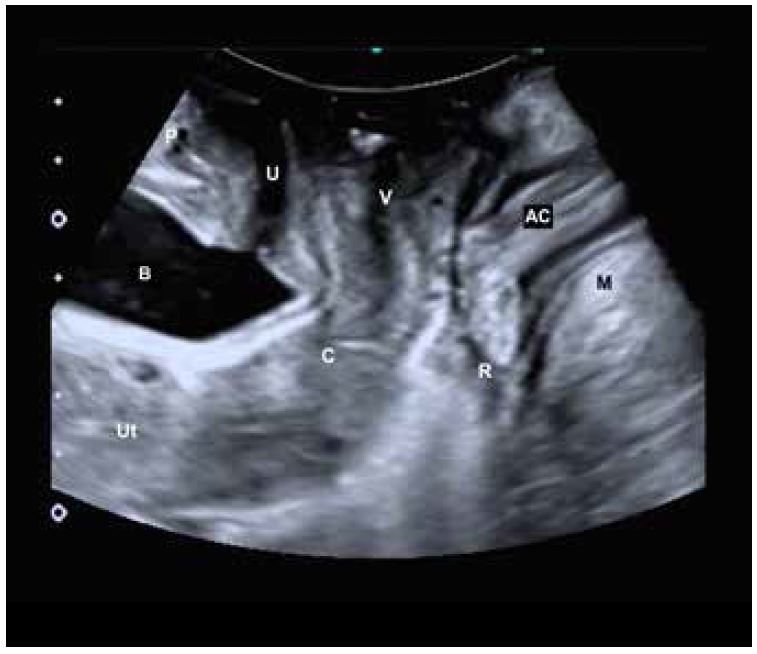 Малюнок 2. Середньосагітальна площина. P: Лобок, U: Уретра, B: Сечовий міхур, V: Піхва, C: Шийка матки, Ut: Матка, AC: Анальний отвір, R: Пряма кишка, M: М'яз-підіймач відхідника (LAM)