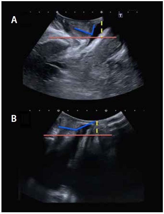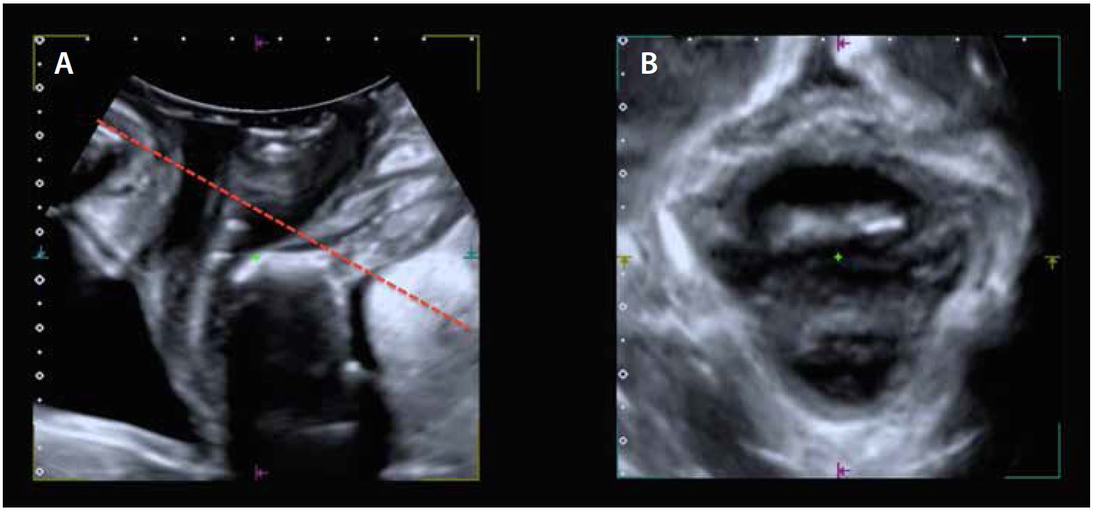 На Малюнку 3. Зображено орієнтир площини мінімальних гіатальних розмірів (червона лінія), яка визначається каудальною частиною лобкового симфізу та аноректальним кутом (A). Площина мінімальних гіатальних розмірів (В)