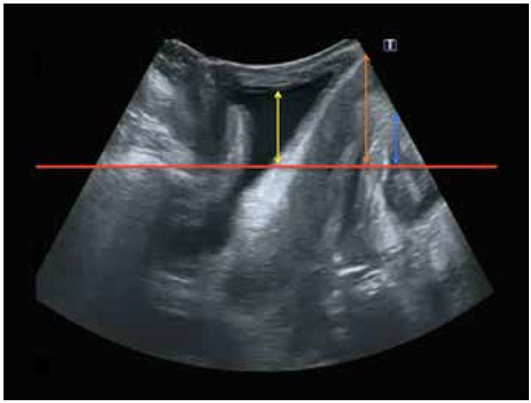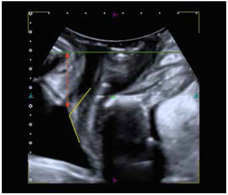 Малюнок 4. Він включає відстань між шийкою сечового міхура і лобковим симфізом (червоний колір) і ретровезикальний кут (жовтий).