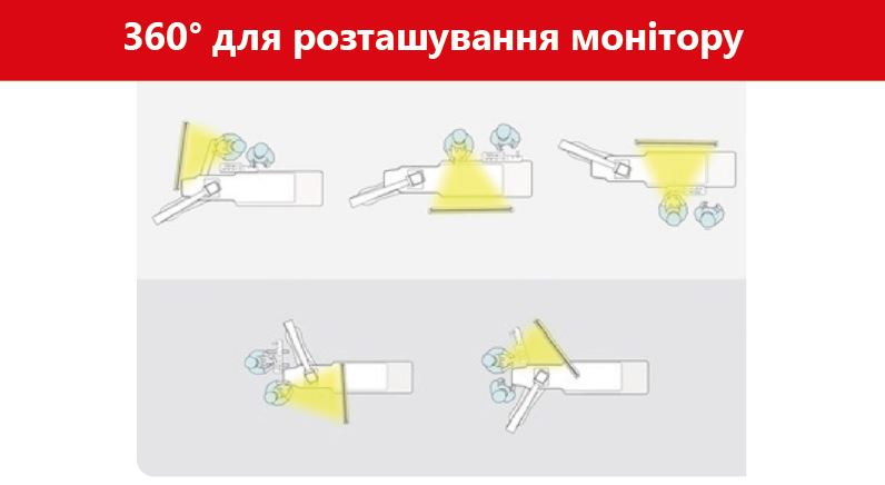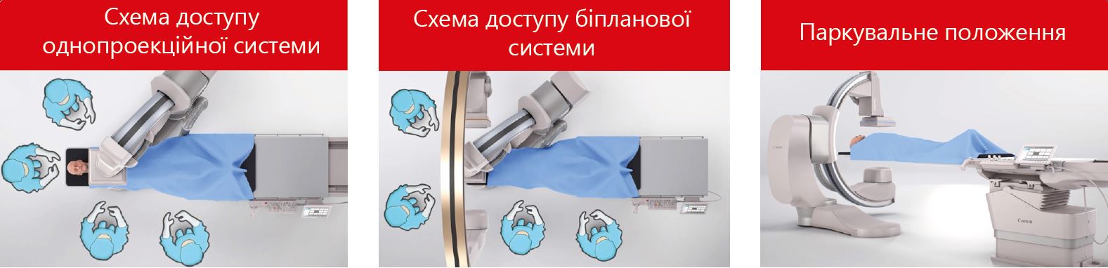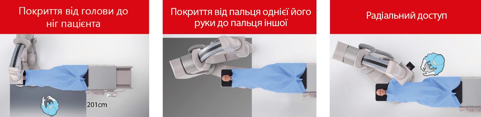 «С-подібну дугу та детектор можна розташувати під різними кутами відносно пацієнта та оператора, зберігаючи орієнтацію зображення. Це важливо, при роботі з пацієнтами, які мають незвичайну статуру , або при використанні альтернативних або декількох точок доступу. Можливість точного налаштування дозволяє мінімізувати дозу опромінення та максимізувати комфорт під час інтервенцій».