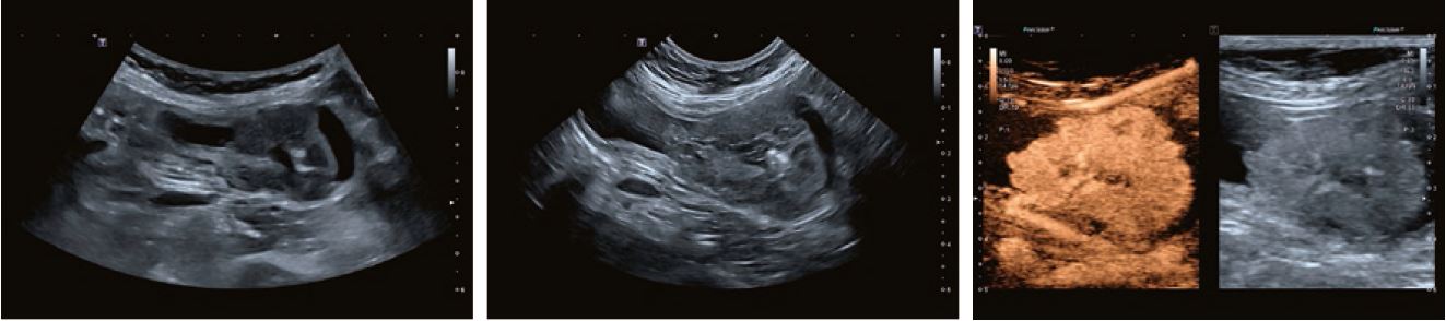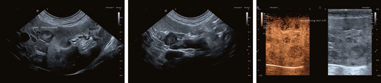 Французький бульдог, десятирічний; поступив з хронічною блювотою і втратою ваги; біохімія крові в нормі, лейкоцити низькі (2400); УЗД з різко гіпоехогенними, неправильної форми ураженнями в печінці і головці підшлункової залози, круглим вогнищем в області правого наднирника; CEUS 2,5 мл Sonoview, датчик 11L3 вимивання уражень печінки через 3,45 хв, на жаль, підсилення надто високе, але все ще діагностоване; евтаназія через два місяці